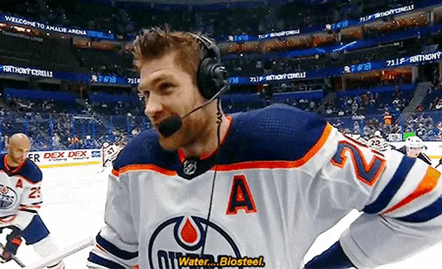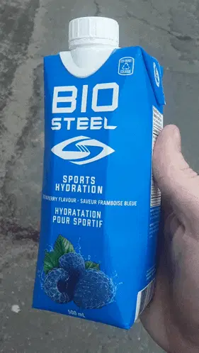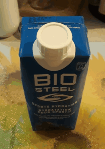 A carton of Biosteel Blue Raspberry Sports Hydration drink sits on a patterned table.