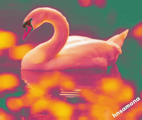 A swan gracefully swims in water, surrounded by vibrant, color-shifting pink, yellow, and orange hues.