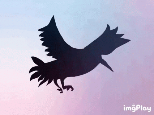 A dark bird silhouette with spread wings flying against a vibrant gradient background of blue, pink, and purple.