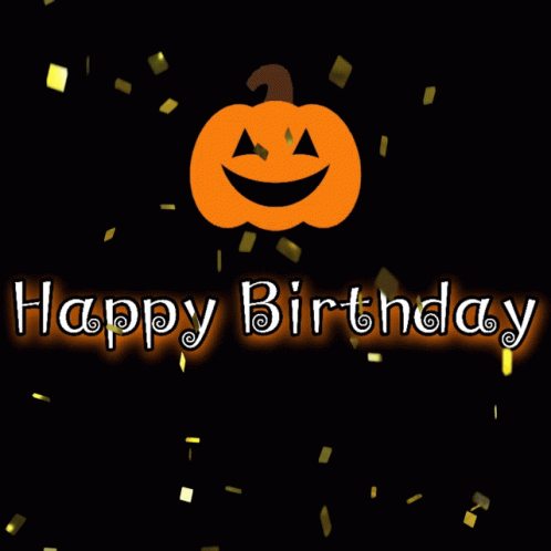A festive Halloween-themed birthday greeting with a smiling pumpkin and falling confetti.