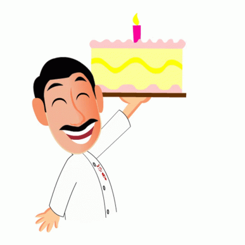 Pak Aji celebrates his birthday, holding a cake with a candle and the word 'HAPPY'.