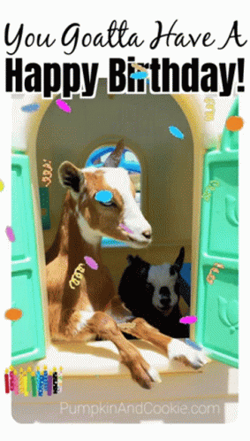 Two cute goats in a playhouse with a 'You Goatta Have A Happy Birthday!' message and falling confetti.