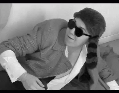 A person dressed as a Russian oligarch, wearing sunglasses and a fur hat, lies on the floor.