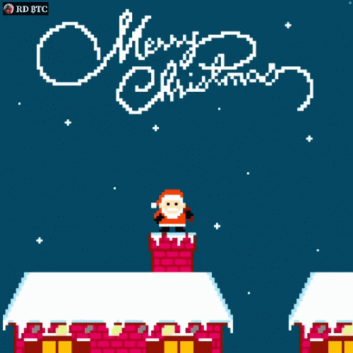 Pixel art animation featuring Santa Claus flying over snowy rooftops with 'Merry Christmas' and 'Bitcoin' themes.
