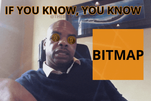Man with Bitcoin coins over his eyes, with 'IF YOU KNOW, YOU KNOW' and 'BITMAP' text.