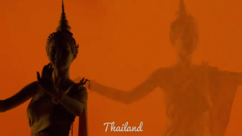 Two women in traditional Thai costumes perform a graceful Thai dance against an orange background, representing Thailand.
