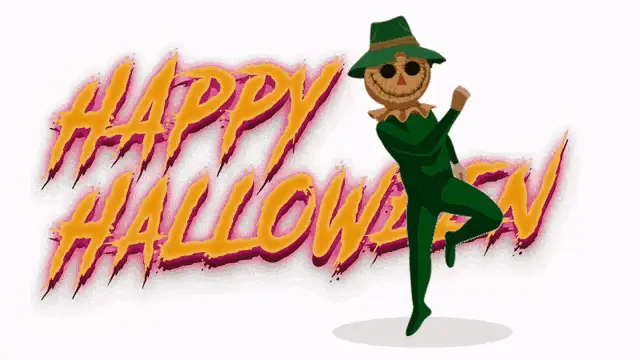 Animated black cat with glowing eyes peeking over a carved Halloween pumpkin with a spider inside.