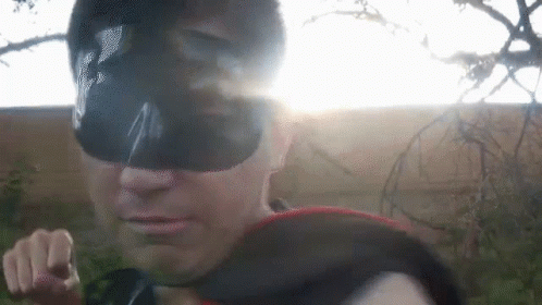 A masked hero in a black mask and headphones points directly at the camera, captured in a dynamic shot.