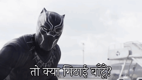 Black Panther meme featuring the Marvel character with a Hindi caption asking 'So, should I distribute sweets?'