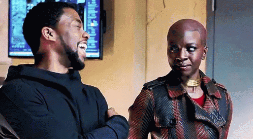 Black Panther T'Challa (Chadwick Boseman) laughs alongside Okoye (Danai Gurira) in a lighthearted moment.