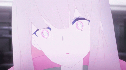Black Rock Shooter with intense, glowing pink eyes and a surprised expression.