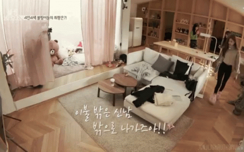 Blackpink's Rose (Park Chaeyoung) excitedly walks in the Blackpink House living room, with Jennie in the background.