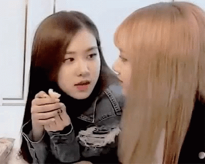 Blackpink members Chaeyoung and Lisa share a close moment, with Chaeyoung holding a small item.