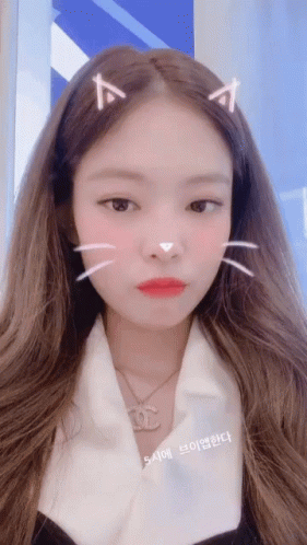 Blackpink's Jennie winks playfully, wearing a cat filter and a Chanel necklace, with a V-app announcement.