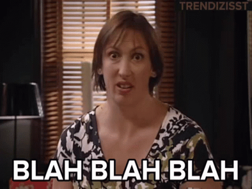 Miranda Hart makes an annoyed face while mouthing 'Blah Blah Blah' in a humorous clip.