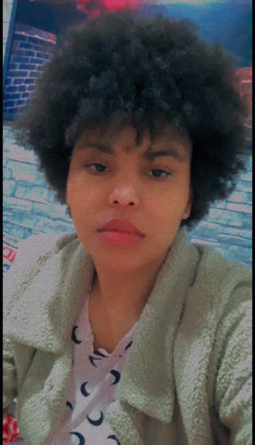 A woman in a green jacket and crescent moon shirt rolls her eyes upwards while taking a selfie.