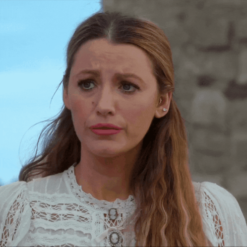 Blake Lively looks upset and concerned, wearing a white lace top with intricate details.