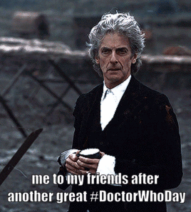 Peter Capaldi as the Doctor, raising a cup in a meme about Doctor Who Day.