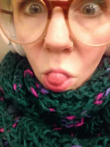 A woman with large glasses and a green scarf makes a funny face, sticking her tongue out and then pulling it back in.