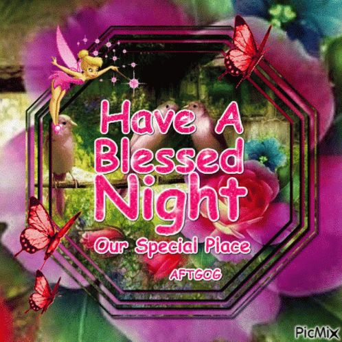 A magical image with a fairy, butterflies, and birds, wishing 'Have A Blessed Night'.