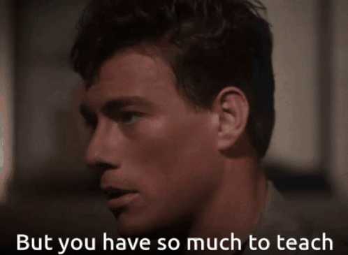 Jean-Claude Van Damme as Frank Dux in Bloodsport, delivering the iconic line 'But you have so much to teach'.