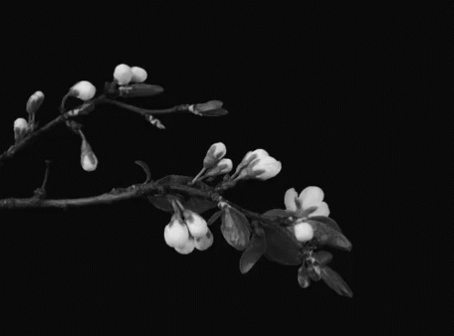 Black and white close-up of a branch with delicate cherry blossoms and buds against a dark background.