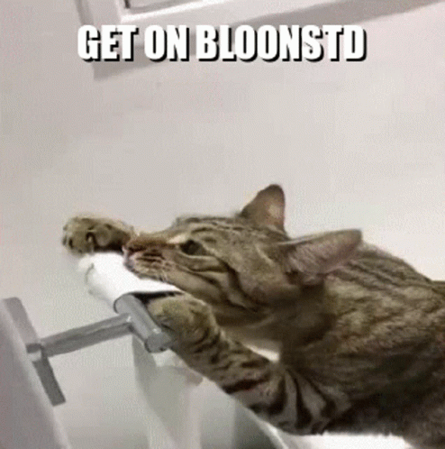 Angry cat intensely playing with a toilet paper roll, with the text "GET ON BLOONSTD" visible.
