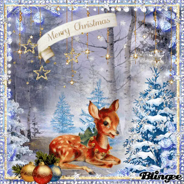 A cute baby fawn with white spots stands in a snowy environment, with the word 'blossom' in pink text.