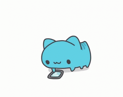 A cute blue Bugcat Capoo checks its phone, sees a low battery, and plugs it in to charge.
