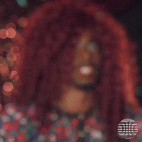 Drag queen with voluminous red curly hair and a vibrant floral jacket, staring intensely at the camera.