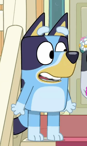 Bluey the cartoon dog is seen standing on stairs, stretching her arms and yawning widely.