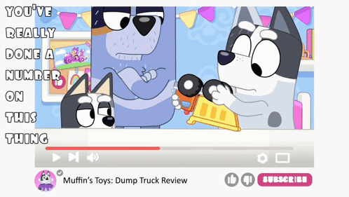 Muffin Heeler and Stripe Heeler review a dump truck toy, with Muffin having 'done a number' on it.