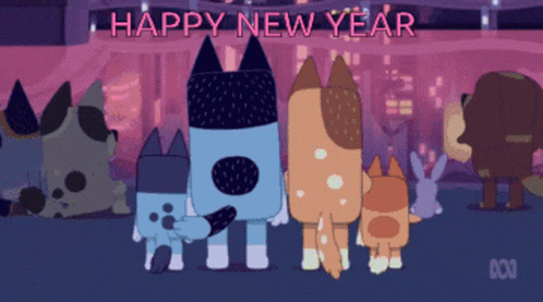 Bluey and family watch colorful fireworks light up the night sky, celebrating New Year's Eve.