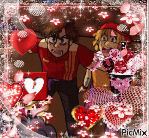 Blueycapsules Jeremike fan art featuring two characters surrounded by hearts and glitter.