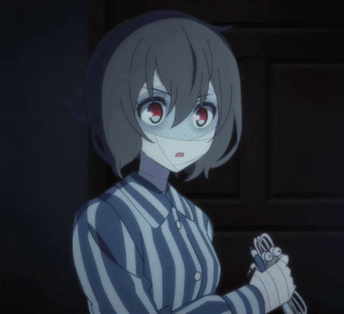 Hoshikawa Lily from Zombielandsaga blushes, looking surprised and embarrassed in her striped pajamas.