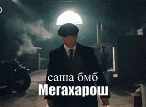 A man in a suit and cap stands in a smoky setting with the Russian text 'Sasha BMB Megakharosh' on screen.