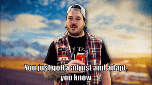 BMD, wearing a plaid shirt, holds a can and shares wisdom: 'You just gotta adjust and adapt, you know'.