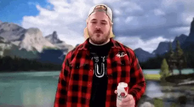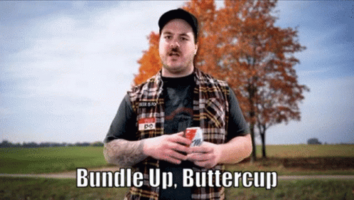 A man in a plaid vest holds a can and says 'Bundle Up, Buttercup' in an outdoor setting.