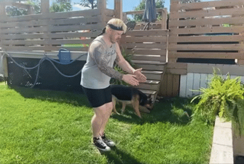 Bmd Bud performs a parkour jump over a low wall in a sunny backyard, with a German Shepherd nearby.