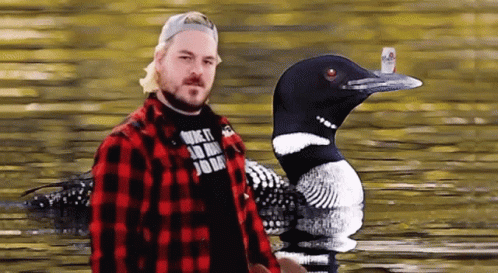 A man in a plaid shirt interacts with a loon prop, placing beer cans and a cymbal on it, referencing BMD Bud.