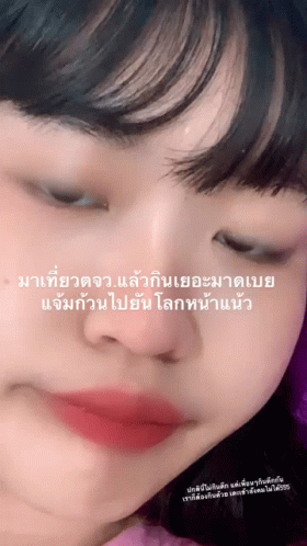 Myyubnk48 from BNK48 with a close-up on her face, featuring Thai captions about eating and travel.