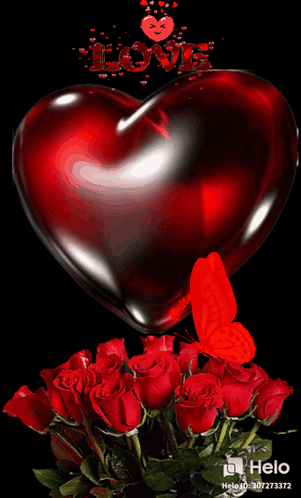 A beautiful red heart, floating small hearts, and the word LOVE above a bouquet of red roses with a butterfly.