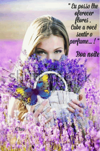 Clau holds a basket of beautiful lavender flowers, accompanied by a butterfly, with a 'Good Night' message.