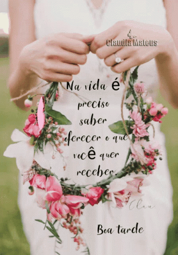 A woman in a white dress holds a beautiful floral wreath with a pink butterfly, featuring a Portuguese quote and 'Good afternoon' message.