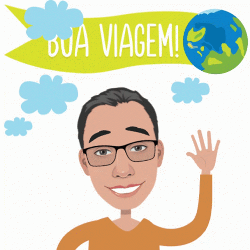 A friendly cartoon man with glasses waves goodbye under a 'Boa Viagem!' banner with an earth and clouds graphic.