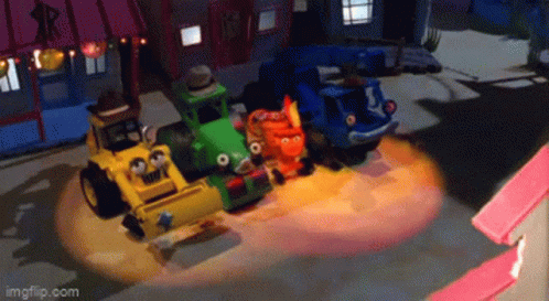 Bob The Builder's friends Dizzy, Lofty, Roley, and Scoop are having a dance party on stage.
