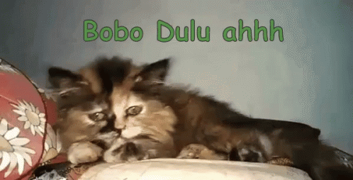 Two fluffy cats, one brown and one calico, cuddle and appear sleepy with the caption 'Bobo Dulu ahhh'.