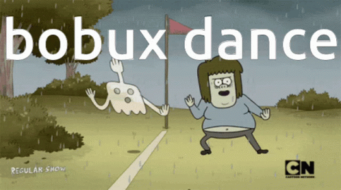 Muscle Man and Hi-Five Ghost from Regular Show perform the 'bobux dance' in the rain, a popular meme.