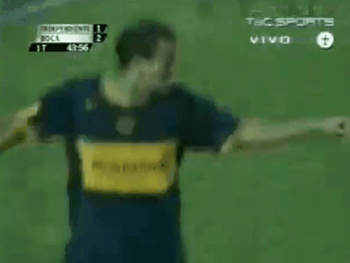 Rodrigo Palacio, wearing his iconic blue and yellow Boca Juniors jersey, points during a football match.