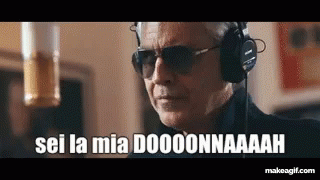 Andrea Bocelli passionately sings 'Sei La Mia Donna' in a recording studio, wearing headphones and sunglasses.